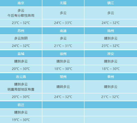 | 这两天的气温总算有点下降趋势 早上7时出门的话 气温还是挺舒服的 ![]() 全省的气温都在21-27℃之间 下午15时全省最高气温也只有33.4℃ 比起盛夏的35°C真的舒服了一些 ![]() 好像天就要这么一天天的凉快下去了 那么,真的是这样吗 来看看本周的天气展望 8月19-25日一周天气预测 本周19-20日全省以多云天气为主,其中苏南部分地区有时有弱降水; 21-23日副高和大陆高压合并,全省天气晴好,气温有所上升,沿江和苏南地区最高气温34°C左右,其它地区31-33°C; 24-25日全省自北向南有一次较强降水过程,并伴有5-7级偏南转偏北大风。 具体预报如下: 20日全省多云,其中苏南部分地区有时阴有小阵雨。 21-23日全省多云有时阴。 24日沿淮和淮北地区多云转中到大雨,其它地区多云转阴。 25日淮河以南地区阴有阵雨或雷雨,雨量中到大,淮北地区阴有小雨并渐止转多云。 ![]() 看来本周虽然有高温,但是也上不了35°C 而立秋之后,雨水渐多 大家外出要注意预防降水 明天是“三伏”的最后一天了 很多人认为出了三伏天就是秋天了 其实并不是的 在气象学上,是这样定义秋天的到来的 ![]() 最后一起来看看明天各地的具体预报吧 ![]()