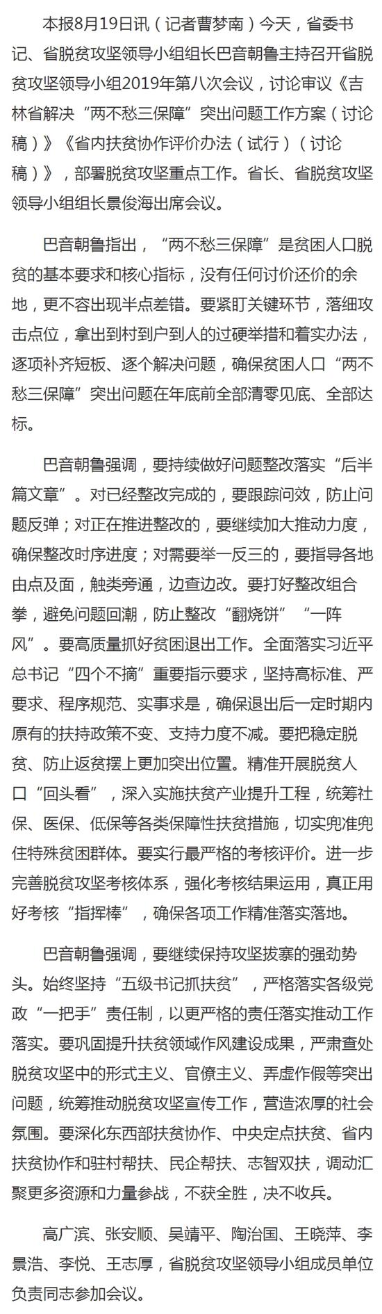 巴音朝鲁主持召开省脱贫攻坚领导小组2019年第八次会议