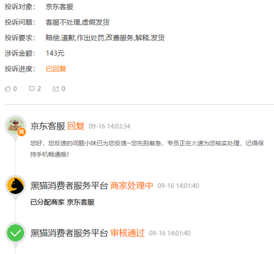 | 近日,黑猫投诉河北站收到网友投诉京东客服:9月12号下单,显示14号到货,结果16号了还没收到,而且期间没有任何人联系我。今天联系京东客服,全部推脱责任,我买的是食用油和牛奶,保质期较短,昨天我看显示16号到货,刚刚看显示17号到货了,我不知道到底什么时候能收到。 我是京东PLUS,经常在京东购物,自营产品一两天就能到。 我的诉求,第一,货物赶紧给我送到,要求送最新日期的我不知道这两天我的东西经历了什么,我不相信品质。第二,京东给我道歉,跟我说明为什么一直送不到而且没有任何解释,即使我找他们也不解决。第三,我不再信任这个平台,我要求暂停PLUS会员,根据我PLUS使用的时间退款。 目前商家已经回复,后续进展,我们将持续关注。投诉详情:https://hebei.tousu.sina.com.cn/complaint/view/17347788064/ 黑猫投诉河北站,守护河北人的消费权益,本地投诉入口链接:https://hebei.tousu.sina.com.cn/