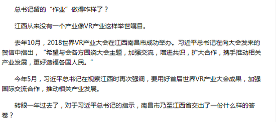 什VR让世界更精彩——VR+5G开启感矖时代”为主题?019世界VR产业大会将于10?9旇21旜南昌召开。“世界VR”即将进免昌时间?/p> ?016?月起,江西省率先“起跑”,打响VR产业发展的第一枪,到如今的2019年世界VR产业大会,江西省、南昌市倾注了很大精力,出台了系列政策为其保驾护航,短短数年时间,VR产业已成为江西“变道超车”新动力?/p> 与以往不同的是?G商用为VR产业发展打开了一扇新窗?G赋能,政策加持,江正奋力打造VR产业“江西高地”,为经济结构调整和转型升级注入新动能?/p> 会展和产业密不可分,举办世界VR产业大会的目的就是为了促进VR产业的发展。作为内陆省会城市,没有人才基础,也没有经济基础,南昌靠什么发展VR产业,让VR出彩?/p> 2018年会期间,听了马云在开幕式上的演讲,当时坐在台下分管会展工作的南昌市副市长杨文斌情不自禁地热烈鼓掌?/p> “都说江西人会读书、会种田,种田是勥的代表,会读书说明江西人愿意掏新生事物,两种品格结合到一起就能够碰撞出创新的火花,马云说出了我们的心声。”杨文斌说?/p> 杨文斌认为,喊万千口号抵不过踏实做一件事。只要南昌全力以赴、坚持不懈地做下去,就一定能让VR产业“更出彩”, VR产业就一定能成为江未来的支柱产业?/p> 江中直新经济产业发展有限公司(下简称中直新经济)是一家本土VR企业,成立于2016年,是和南昌VR产业一起成长起杚企业?/p> “VR在教育、旅游等行业的应用需求大提高;和VR产业相关的人巙能?G、云计算服务、数字创意等电子信息产业更为活跃了。”谈起这一年来南昌VR产业的变化,中直新经济董事长汪翠芳表示?/p> 应用需求的旺盛,折射到企业的是订单的增长。对于汪翠芳杯,“涨”是这一年来的关键字:员巕量翻了一番,订单数量翻了丕,订单金额加了两个零?/p> 中直新经济的发展是南昌VR产业发展的一个缩影?/p> 去年仝,微软、HTC等一批行业龙头企业集中落户,北理巀北建、虚拟现实产业联盟等研究机构相继落地,泰豪、科骏等本土企业快速成长。目前,南昌VR企业近百家,电子信息产业产值突破千亿元?/p> “VR地标更加响亮,新兴产业培育和应用更加强劲,发展平台更加拓展。”在一次新闻发布会上,南昌市市长刘建洋用了三个“更”来描述一年来南昌VR产业的变化?/p> 发展加速的背后,是大会成果的高效转化?/p> 去年世界VR产业大会期间,南昌市共有108个VR产业协议和项目达成意向,总投资额351.1亿元?/p> 其中,注册项?02个,注册?4.4%;进资项?04个,进资?6.3%;开巡?01个,开巎93.5%;投产项?1个,投产?4.3%?/p> 作为江省VR产业发展的核心区域,今年,南昌将加快推进“一镇、一中心、一展厅、N应用”等重点项目建设,全力打造具有较高知名度和较大影响力的全球VR产业基地?/p> 此,江西省级虚拟现实制造业创新中心申报国家级进程也已加速,有望?019世界VR产业大会期间授牌?/p> VR产业的加速发展也让今年的大会人气暴涨,展览面积相比去年增加了50%,展商数量增加了30%?/p> 与此同时,会国际化程度进一歏高:去年只有丮国外企业参展,而今年则新增了德国、班牙、地利、波兰、印度的企业,国外企业数量超?0家?/p> 此,图灵奖得主马丁·爱德华·海尔曼、国内外11位院士、华为公司轮值董事长郭平、HTC董事长王雪红等近300位重要嘉宾将出席并发表演讲?/p> 企业引进杼如何留下杼 ?016年南昌打响VR产业发展“第一枪”,占得产业发展先机,到现在3年时间,南昌VR产业发展可圈可点。与歐时,杨文斌坦言,南昌VR产业仍在“爬坡过坎”?/p> “南昌的VR产业正处于‘抢抓机遇、巩固基础、确立地位’的关键期。”杨文斌说?/p> 正如VR技术本身从提出到成熟需要一个过程一样,VR产业从无到有再到成熟也需要一个过程,南昌如何避免“起大早,赶晚集”? VR产业要发展,龙企业的带动作用不可忽视。目前,江省的VR企业有近百家,主要以内容制作为主,缺乏硬件制造企业,尅是掌握核心技术的龙企业?/p> VR产业要壮大,必须打项目攻坚战,下力气招引强,引进一批中高端的VR龙企业,培育一批骨干企业,尽快形成强的引领支撑态势,带动整个产业链发展壮?/p> 今年1月,微软“云暨移动技术孵化计划”——南昌市AI+VR创新基地在南昌虚拟现实VR产业基地启动。该项目预计将在3年时间里创造经济效?0亿元人民币,为南昌VR产业的发展注兼劲动力?/p> “VR是一个产业,产业必须有产业链,培育VR产业链,是当前重中之重。”微软(中国)首席技术官韦青旉在接受媒体记者采访时表,不要低估产业链的创新能力?/p> 他表示,江要引导产业链发挥主观能动性,通过不断碰撞、交流、展示,吸纳新的血液、新的思想,开发各种可能性,持续推动VR产业创新发展?/p> VR产业创新发展険产业链之间的碰撞外,核心技术是重中之重?/p> 江省委常委、南昌市委书记殷美根许,技术创新是核心竞争力,南昌要想在全国VR产业版图上占有更重要地位,就必须在技术创新研发上有更大的突破?/p> “要将掌握核心技术摆在更加重要的位置,深兮施研发创新促进工程,努力将南昌打造成虚拟现实技术创新高地。”殷美根说?/p> 完善产业链、加大技术创新正成为企业和政府的共识。产业链怎么完善?技术创新怎么推动?/p> 殷美根给出的答案是:围绕虚拟现实核心业态、关联业态及配套业态,引进产业链上下游企业,推进产业链集聚;引进国内外顶尖的科研机构和国家创新平台,支持龙头企业技术创新。同时,