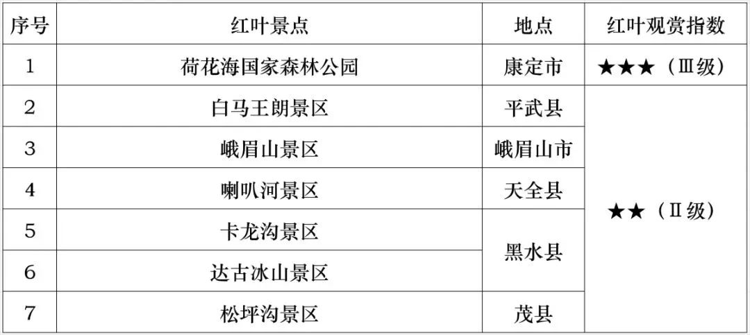 ![]() 四川在线消息(蒲香琳 记者 王成栋)入秋后,天气越来越凉,秋意越来越浓,叶子越来越红。10月12日,四川省林业和草原局授权四川省生态旅游协会监测发布2019年度全省第一期红叶观赏指数。 ![]() 根据各地气候和红叶变化情况来看,本周末,康定市的荷花海国家森林公园、平武县的白马王朗景区、峨眉山市的峨眉山景区、天全县的喇叭河景区、黑水县的达古冰山景区、卡龙沟景区、茂县的松坪沟景区等地进入红叶观赏时间。 ![]() 四川省林业和草原局提醒:进山观赏红叶要 注意天气变化,以安排行程、增减衣物,同时切忌禁携带火源进入林区。 ![]() ![]()