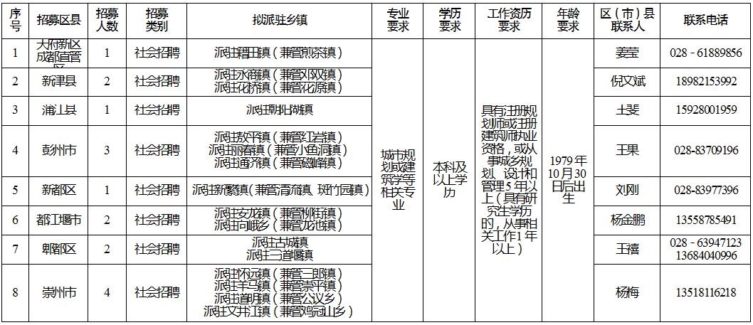 成都全搜索新闻网10月14日讯 据省人社厅官网消息,成都将面向社会公开招募31名乡村规划师,有意应聘者于10月28日至10月30日在高新区锦晖西一街99号布鲁明顿广场B座810进行现场报名及资格审核。根据公告,专业技术人员年薪为10万元人民币,其中,派驻在彭州市、崇州市、都江堰市、邛崃市、大邑县、金堂县、蒲江县、简阳市的乡村规划师每人每年增加生活补贴2万元人民币。 第九批乡村规划师社会招聘岗位需求表 ![]() ![]() 原文如下: 成都市第九批乡村规划师招募公告 2010年9月,成都在全国首创乡村规划师制度以来,每年面向社会公开招募优秀的规划专业人才派驻到乡镇,代表乡镇政府履行规划职能,为全市新农村建设提档升级、乡村规划质量和建设水平的提高起到了积极的作用。 为深入贯彻党的十九大精神,全面落实中央、省、市乡村振兴战略的部署,紧紧围绕五大振兴中的“人才振兴”的要求,持续提升成都市乡村规划建设水平,助推全市幸福美丽乡村建设,成都市继续面向社会公开招聘、征集第九批乡村规划师,现将有关事项公告如下。 一、工作岗位及主要职责 (一)岗位名称:成都市乡村规划师 (二)招聘范围: 1﹒社会招聘招募区(市)县:成都天府新区、新都区、郫都区、简阳市、都江堰市、彭州市、邛崃市、崇州市、金堂县、新津县、大邑县、蒲江县(具体信息详见附件1)。 2﹒机构志愿者、个人志愿者招募区(市)县:成都天府新区、成都高新区、龙泉驿区、青白江区、新都区、温江区、双流区、郫都区、简阳市、都江堰市、彭州市、邛崃市、崇州市、金堂县、新津县、大邑县、蒲江县。 (三)主要职责:代表乡镇政府组织相关规划编制,对乡村规划及项目设计方案进行初步审查,就乡村规划实施、项目建设进行指导,并提出改进乡村规划工作的意见和建议等。 二、乡村规划师任职条件 (一)具有城市规划、建筑学等相关专业本科及以上学历。 (二)具有注册规划师或注册建筑师执业资格,或从事城乡规划、设计和管理工作5年以上(具有研究生以上学历的,从事相关工作1年以上)。 (三)身体健康,年龄40周岁以下(1979年10月30日后出生)。 三、招募方式及待遇 (一)社会招聘。按照报名、笔试、面试、体检的流程面向全国公开招聘符合条件的专业技术人员,实行年薪制,按现行政策年薪为10万元人民币,其中,派驻在彭州市、崇州市、都江堰市、邛崃市、大邑县、金堂县、蒲江县、简阳市的乡村规划师每人每年增加生活补贴2万元人民币。 (二)机构志愿者。按照报名、面试的流程面向全球征集优秀规划或建筑设计单位、在蓉高校、开发企业等机构,选送符合条件的专业技术人员,其待遇由派出单位解决。 (三)个人志愿者。按照报名、面试的流程面向全球公开征选符合条件的专业人员,其补贴补助由各区(市)县人力资源和社会保障部门按相关政策执行。 四、报考程序 (一)报名及资格审核。有意应聘者请于10月28日至10月30日在高新区锦晖西一街99号布鲁明顿广场B座810进行现场报名及资格审核。现场提交“成都市第九批乡村规划师报名表”,并审核身份证、毕业证、学位证、工作社保证明、职称证、执业资格证等原件,其中机构志愿者和个人志愿者还需提供单位推荐文件。报考人员如弄虚作假或隐瞒有关情况骗取报名或聘用的,将随时取消其资格,所造成的一切损失由报考者本人承担。 有意应聘者每人限报一个区(市)县,并在区(市)县内部服从岗位调配。 (二)笔试:笔试考一科,主要测试应聘人员城乡规划、国土空间规划体系基础知识及成都市镇、村规划相关技术标准等,考试不指定参考资料;11月4日前,在“成都规划和自然资源公众平台”和“成都市城市规划协会”网站上发布参加笔试人员名单、笔试时间及地点,笔试不需打印准考证,参加笔试人员凭身份证原件到考场按照座位图就座参加考试,笔试成绩按50%的比例计入总成绩。在“成都规划和自然资源局公众平台”和“成都市城市规划协会”网站上按区(市)县招聘人数与进入面试人数1:3的比例发布笔试合格、进入面试人员名单。 (三)面试:12月3日前,由成都天府新区、成都高新区,相关区(市)县组织面试,成都市规划和自然资源局参加;面试时间及地点由相应区(市)县至少提前2个工作日进行电话通知,面试不需打印准考证,参加面试人员凭身份证原件按时到场参加面试,社会招聘乡村规划师面试成绩当场公布并按50%的比例计入总成绩,机构志愿者和个人志愿者面试结果在面试结束后2个工作日内电话通知。 (四)体检:根据总成绩确定入职体检人员名单,体检标准参照《<公务员录用体检操作手册(试行)〉有关内容的通知》(人社部发〔2016〕140号)等规定执行。若因进入体检人员未按要求参加体检或体检不合格出现的空缺,按照该岗位已参加面试人员总成绩从高分到低分(如总成绩相同,按笔试总成绩排序)依次进行等额递补(递补时间和次数:在体检结束之后的3天内,最多递补2次)。 (五)公示:在“成都规划和自然资源局公众平台”和“成都市城市规划协会”网站上公示拟聘用人员名单,公示时间为5个工作日。 (六)聘用:公示结束后,成都天府新区、成都高新区管委会,相关区(市)县政府与聘用的第九批乡村规划师签订聘用合同,聘用期限为2-4年,试用期为3个月,试用不合格的,不予正式录用。聘用期满,年度考核合格的可续聘
