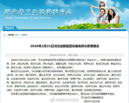 中新网2月22日电 据河北省卫健委官方微博消息,2020年2月21日0—24时,河北省报告新型冠状病毒肺炎新增确诊病例1例(石家庄市)。新增治愈出院病例14例,其中,唐山市3例、保定市2例、邢台市2例、邯郸市2例、石家庄市1例、承德市1例、张家口市1例、秦皇岛市1例、廊坊市1例。新增死亡病例1例(秦皇岛市)。无新增疑似病例。 截至2月21日24时,河北省累计报告确诊病例309例,其中在院治疗119例,现有重症病例11例,累计治愈出院184例,死亡6例。确诊病例中,唐山市57例、沧州市48例、张家口市34例、保定市32例、邯郸市31例、廊坊市30例、石家庄市29例、邢台市23例、秦皇岛市10例、衡水市8例、承德市7例;死亡病例中,沧州市3例、秦皇岛市1例、唐山市1例、邢台市1例;重症病例中,唐山市3例、石家庄市2例、沧州市2例、秦皇岛市1例、廊坊市1例、保定市1例、邯郸市1例;出院病例中,保定市29例、张家口市25例、廊坊市22例、沧州市22例、唐山市19例、邯郸市19例、石家庄市15例、邢台市15例、承德市6例、秦皇岛市6例、衡水市6例。现有疑似病例0例。 目前累计追踪到密切接触者10539人,当日解除隔离医学观察303人,现有829人正在接受隔离医学观察。