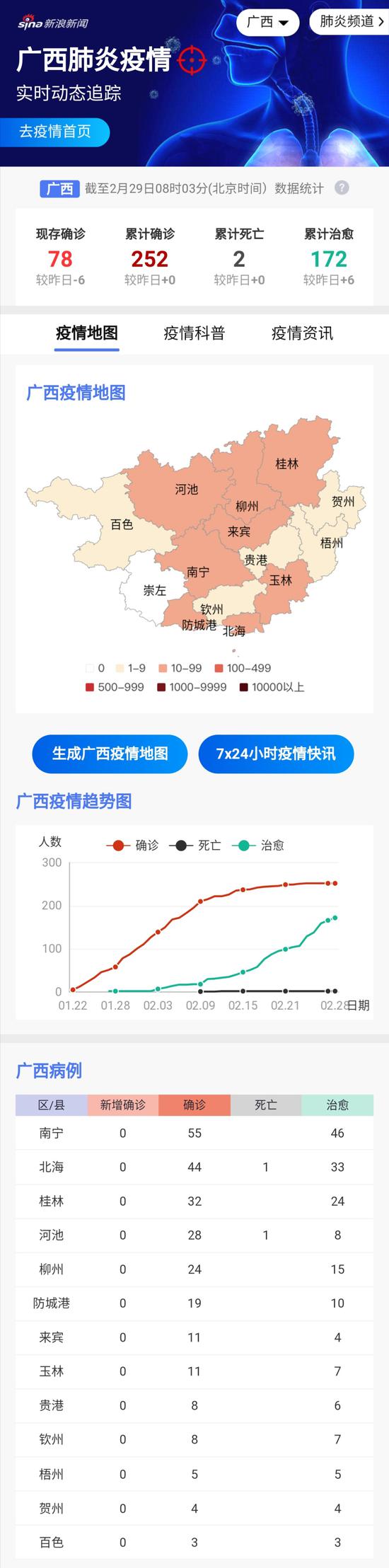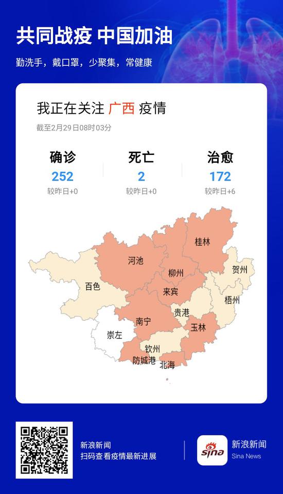 2月28日0-24时,我区无新增新型冠状病毒肺炎确诊病例;无新增疑似病例;新增治愈出院病例6例(南宁市2例,北海市1例,防城港市2例,来宾市1例);无新增死亡病例。 ![]() 目前全区累计报告确诊病例252例,累计出院病例172例,累计死亡病例2例(河池市1例、北海市1例),现有确诊病例78例,均在院治疗,其中重症病例1例(桂林市1例),危重病例5例(南宁市1例、北海市1例、防城港市2例、河池市1例);现有疑似病例0例。 ![]() 累计确诊病例中,南宁市55例、柳州市24例、桂林市32例、梧州市5例、北海市44例、防城港市19例、钦州市8例、贵港市8例、玉林市11例、百色市3例、贺州市4例、河池市28例、来宾市11例。 本日新增密切接触者4人,现有716人正在接受医学观察。 为降低或消除不良生活行为方式对身体健康影响,进一步提升机体免疫力,预防新冠病毒等病原体的感染。专家建议,在做好个人日常防护的同时,应建立良好的健康生活方式。一是合理膳食。每天尽可能摄入更多种类的食物,以谷类为主,粗细搭配,常吃粗粮、杂粮和全谷类食物;多吃蔬菜水果和薯类;每天吃奶类、大豆或其制品,常吃适量的鱼、禽、蛋和瘦肉;减少烹调油,吃清淡少盐饮食。二是适量运动。加强身体活动,包括家务、交通、工作和闲暇时间锻炼(含定期进行一定强度的运动)等,养成规律运动的习惯,日常生活少静多动。三是戒烟限酒。吸烟是肺癌、慢性呼吸系统疾病等多种疾病发病和死亡的主要危险因素,国内外科学证据证实,越早戒烟越有益健康,任何时候戒烟都不晚。过量饮酒对健康有多重危害,孕妇和儿童青少年禁止喝酒。四是心理平衡。应具备无心理疾病和具有一种积极发展的心理状态,若对照美国心理学家马斯洛10条心理健康标准,有一定距离的,有针对性地进行心理调整与心理锻炼,必要时及时求医。 来源: 自治区卫生健康委员会 |