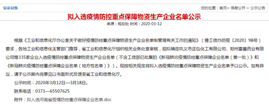 大河财立方消息 3月12日,河南省工信厅对拟入选疫情防控重点保障物资生产企业名单进行公示,巩义市正弘化工有限公司、郑州雷曼药业有限公司等335家企业入选。